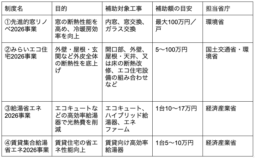 今年も昨年に続き、対象となる省エネ工事に応じて、以下の4つの事業が実施されます。