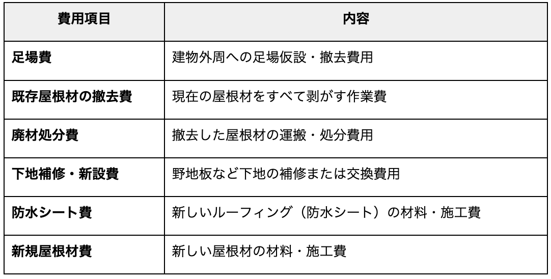 既存の屋根材を全面撤去するため、撤去費・廃材処分費・足場費・下地補修費・新規屋根材費と、費用項目が多く積み重なります。リフォームの中でも高額な部類に入る工事であることは否めません。見積もりは主に以下の項目で構成されます。