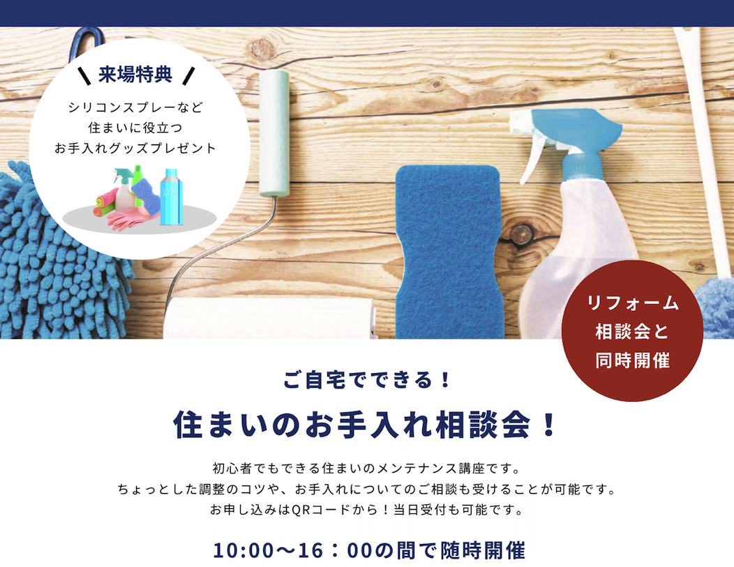 当日は、初心者の方でも取り入れやすい住まいのメンテナンス方法もご案内します。