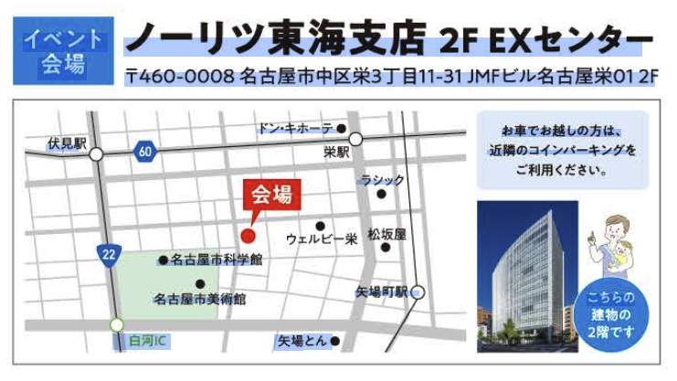 会場:ノーリツ東海支店 2F EXセンター(名古屋市中区栄3丁目11-31 JMFビル名古屋栄01 2F)